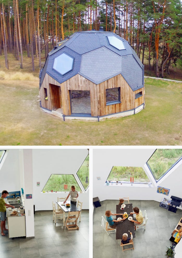 Sono case geodetiche, strutture composte da una rete di triangoli che distribuiscono il peso in modo uniforme. Risultato: grande stabilità, uso ridotto di materiali (fino al 33% in meno) e una capacità notevole di trattenere il calore.